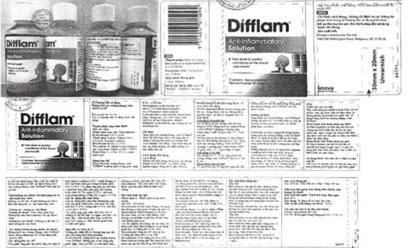 – Thành phần, cấu tạo, công thức hóa học: Mỗi mL chứa: Thành phần hoạt chất: 1,5 mg Benzydamine hydrochloride (tương đương 0,15% kl/tt) Thành phần tá dược: 0,1 ml Ethanol 96%; 50mg Glycerol; 0,32 mg Saccharin sodium; 0,3mg Mouthwash flavour 52.503T; 0,055mg Polysorbate 20; 1mg Methyl hydroxybenzoate; 0,02mg Quinoline Yellow (CI No: 47005); 0,003mg Patent blue V (CI No: 42051), nước tinh khiết. – Cơ chế hoạt động: Nhóm dược lý: Thuốc điều trị tại chỗ ở miệng. Cơ chế tác dụng: Cơ chế tác dụng chống viêm của benzydamine không liên quan đến việc kích thích trực tuyến yên-vỏ thượng thận. Giống như các tác nhân chống viêm không steroid khác, benzydamine ức chế sinh tổng hợp các prostaglandin trong những điều kiện nhất định, nhưng những đặc tính của benzydamine về mặt này chưa được làm rõ hoàn toàn. Tác dụng ổn định màng tế bào cũng có thể là một cơ chế tác dụng của benzydamine. – Cách dùng, liều dùng: Cách dùng Không nên pha loãng Dung dịch súc miệng kháng viêm Difflam, tuy nhiên trong trường hợp bị châm chích, đau nhức tại khoang miệng có thể pha loãng thuốc với nước trước khi dùng. Nhổ bỏ dung dịch thuốc ra khỏi miệng sau khi súc, Dùng thuốc liên tục không được quá bảy ngày, trừ khi có sự giám sát y tế. Liều dùng Liều dùng ở người lớn Khi sử dụng để súc miệng, liều thường dùng là 15mL Dung dịch súc miệng kháng viêm Difflam (khoảng 1 muỗng súp) trong vòng ít nhất 30 giây mỗi 1,5-3 giờ nếu cần. Trường hợp có tổn thương ở vùng miệng, liều chỉ định thông thường là 15 mL Dung dịch súc miệng kháng viêm Difflam (khoảng 1 muỗng súp) trong vòng ít nhất 30 giây, mỗi 1,5-3 giờ trong cả ngày. Liều dùng ở trẻ nhỏ Súc miệng với 5-15 mL dung dịch súc miệng kháng viêm Difflam nếu trẻ có thể tự súc Dùng thuốc cho trẻ nhỏ Do còn thiếu các dữ liệu lâm sàng đầy đủ, không khuyến cáo chỉ định dùng Dung dịch súc miệng kháng viêm Difflam cho trẻ dưới 6 tuổi. – Hàm lượng tính trên trọng lượng: Benzydamine hydrochloride 0,15% (kl/tt) Thành phần tá dược (mỗi 1ml): 0,1 ml Ethanol 96%; 50mg Glycerol; 0,32 mg Saccharin sodium; 0,3mg Mouthwash flavour 52.503T; 0,055mg Polysorbate 20; 1mg Methyl hydroxybenzoate; 0,02mg Quinoline Yellow (CI No: 47005); 0,003mg Patent blue V (CI No: 42051), nước tinh khiết. – Thông số kỹ thuật: Chai 200 ml. – Công dụng theo thiết kế: Chỉ định: Dung dịch súc miệng kháng viêm Difflam được chỉ định làm giảm tình trạng đau ở miệng và họng bao gồm các trường hợp viêm amidan, đau họng, viêm niêm mạc do bức xạ, nhiệt miệng, hậu phẫu miệng và hậu phẫu nha chu.