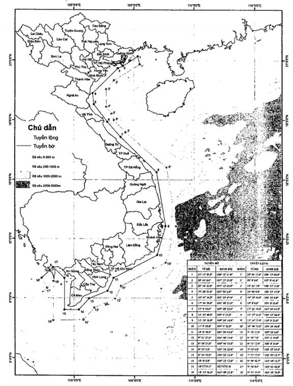 6. Tuyến lộng là đường gấp khúc được tạo bởi các đoạn thẳng nối liền từ điểm 01’ đến điểm 18’. Tọa độ các điểm từ điểm 01’ đến điểm 18’ được xác định bởi kinh độ và vĩ độ quy định tại Phụ lục III ban hành kèm theo Nghị định này.